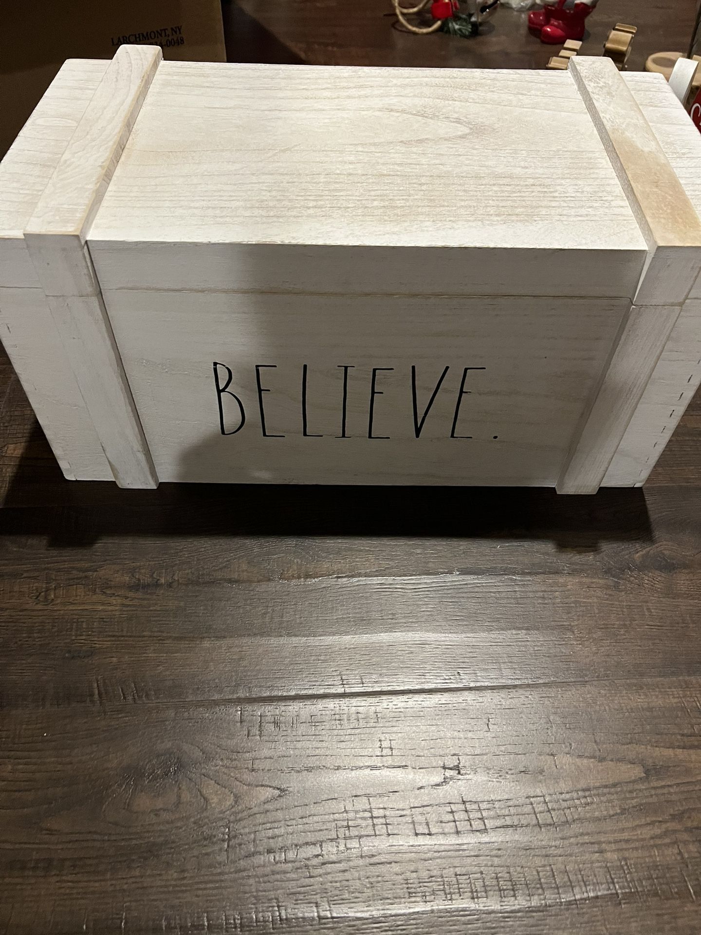 Decorative wooden box with 'Believe' inscription.