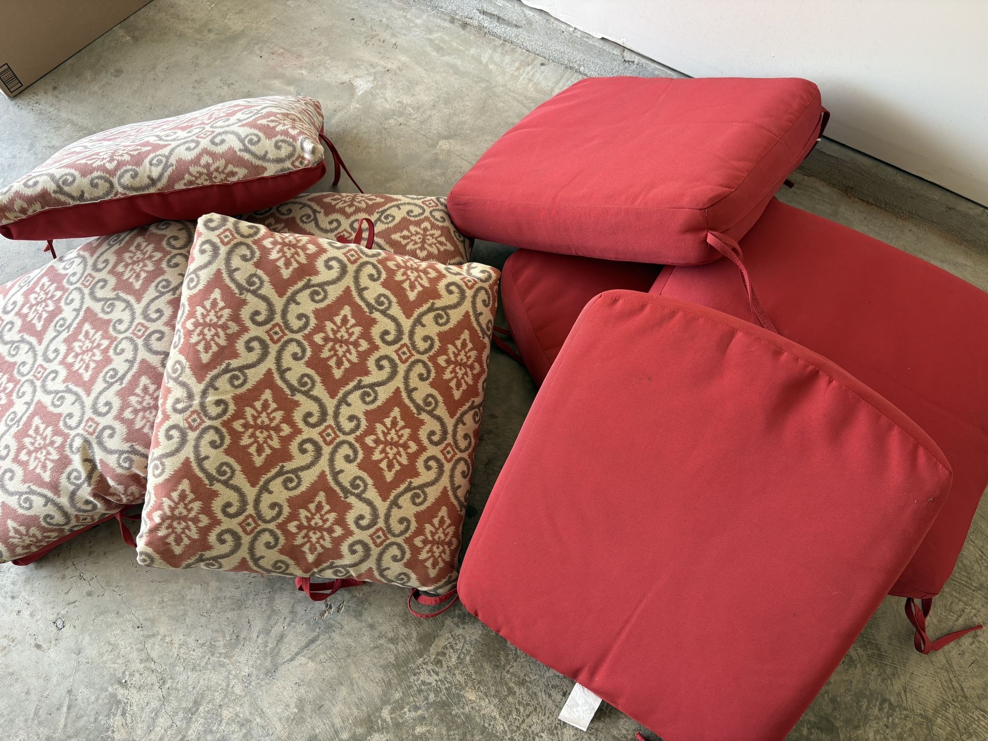 Discounted to $70 from $100 Collection of red and patterned patio chair cushions, perfect for outdoor or indoor use. Cushion dimensions: Bottoms 26” deep x 24” wide x 5” thick Backs 22” high x 24” wide x 5” thick Backs are patterned on one side and red on the other.