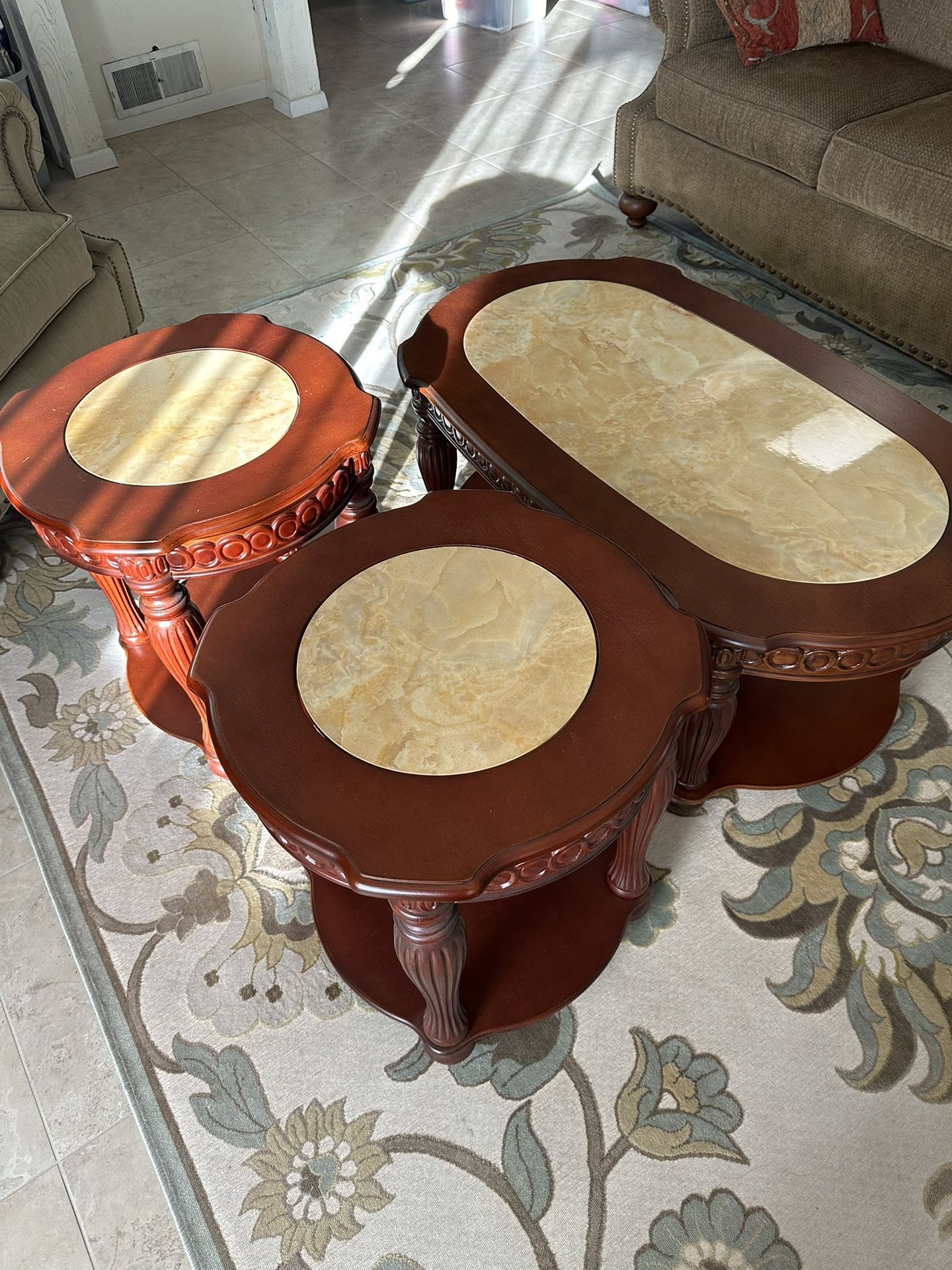 Living room furniture set in great condition. Dimensions: Coffee table: 18.5”H x 41.5”W x 23”D Side tables: 22.5”H x 21.5”W Local pick up in TEMPLETON.