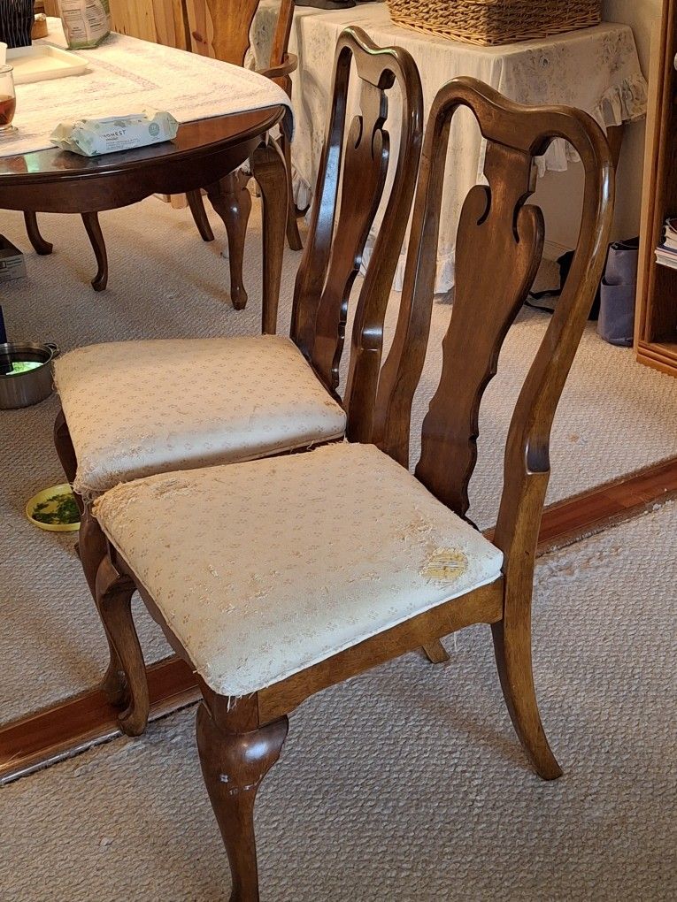 Five Dining table chairs 4 regulars and 1 captain chair- Fabric seat cushions will need to be reupholstered! The wood is in excellent condition, but kitties did a number on the cushions