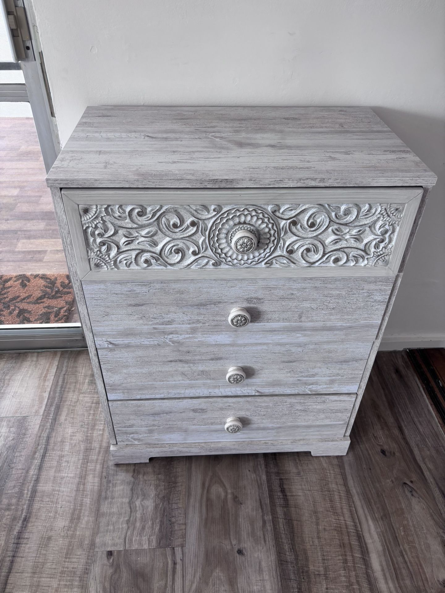 Solid engineered wood and particle board dresser with four drawers. Perfect to be used as a small dresser, chest of drawers, or storage/organization.
