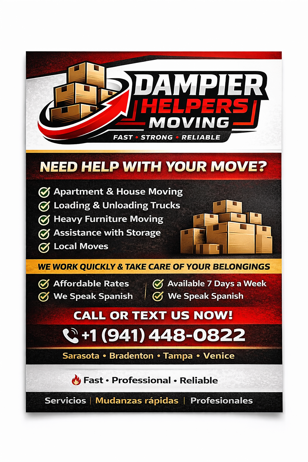 Need help with your move? We’ve got you covered! ✔ Apartment & house moving ✔ Loading & unloading trucks ✔ Heavy furniture moving ✔ Storage moves ✔ Local moves 💪 Fast • Reliable • Professional Serving: 📍 Bradenton 📍 Sarasota 📍 Tampa 📍 Venice 📞 Call or text: (contact info removed) 💬 We also speak Spanish. ⚡ Message us today for a quick quote!