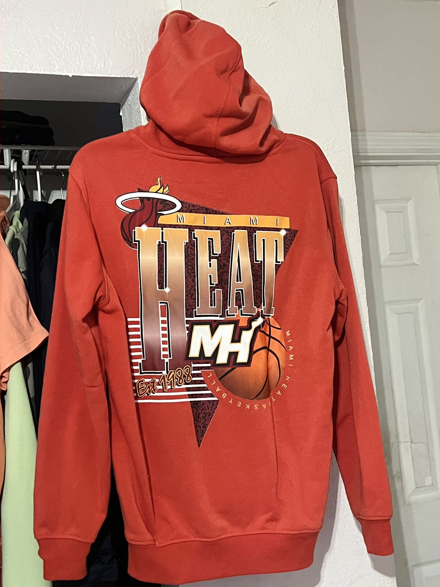 Size Small/Medium Red/Orange Miami Heat hoodie with logo.