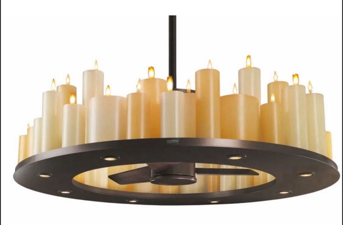 Delivery Available Casablanca Candle Lit Chandelier / Ceiling Fan Combo with Real Wax Candles and Flickering Bulbs Features: The Candelier's design features 48 genuine wax candles in varying heights and colors that range from ivory to honey, nestled around an Oil-Rubbed Bronze ring and sleek, three-blade ceiling fan. Each candle is fitted with a 3-watt bulb that captures the natural flickering motion and incandescent glow of a real candle.