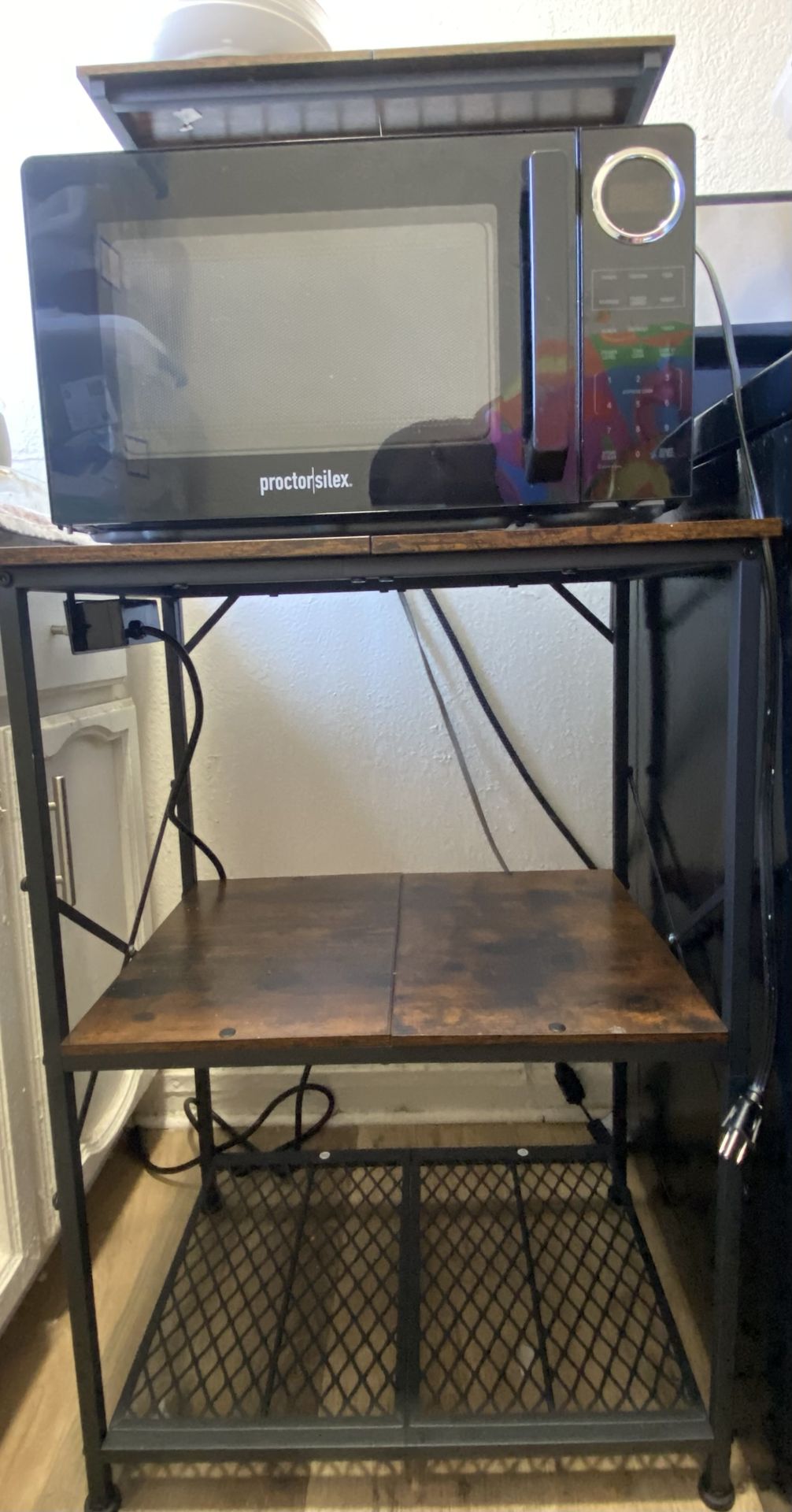 Microwave and kitchen desk stand. Great shape. Has outlets. Available for pick up only in 90018.