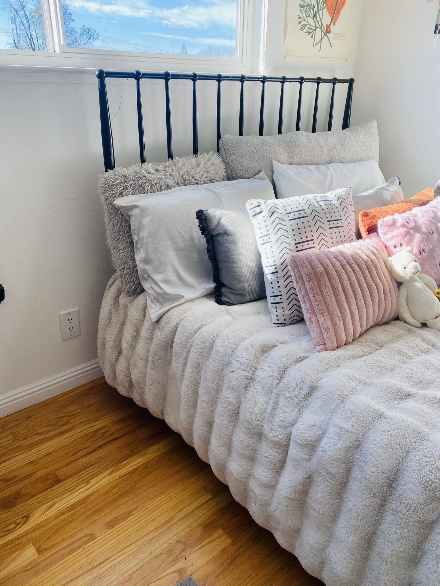 Selling a black metal bed frame, size is full, in great condition, comes with mattress ( my daughter used for a short time).