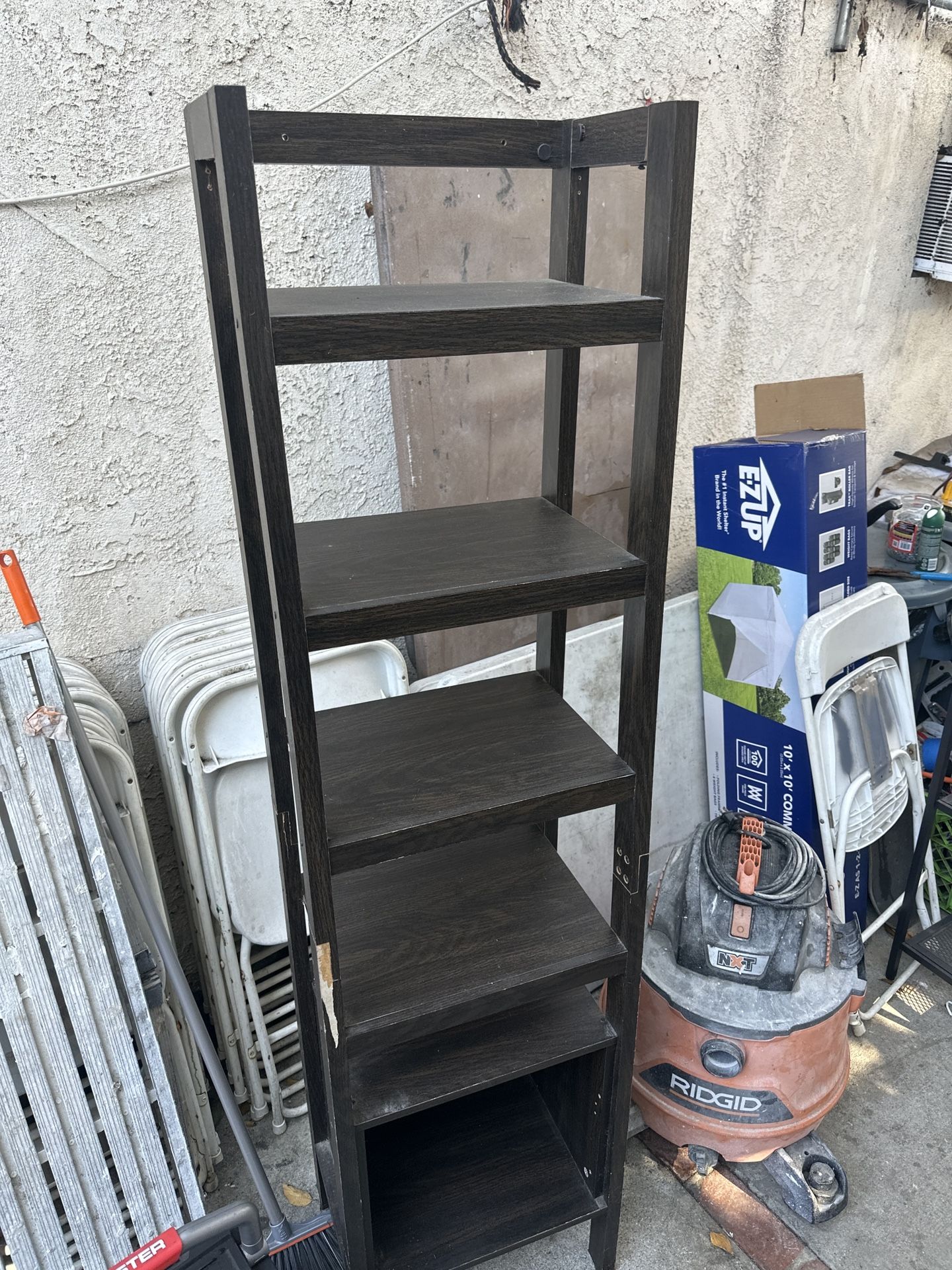 Sturdy tall shelving unit with dark wood finish. Approx. 5 ft 9 in tall. Multiple shelves for books, storage, or decor. Used, good condition with minor cosmetic wear. Pickup only. $50 OBO