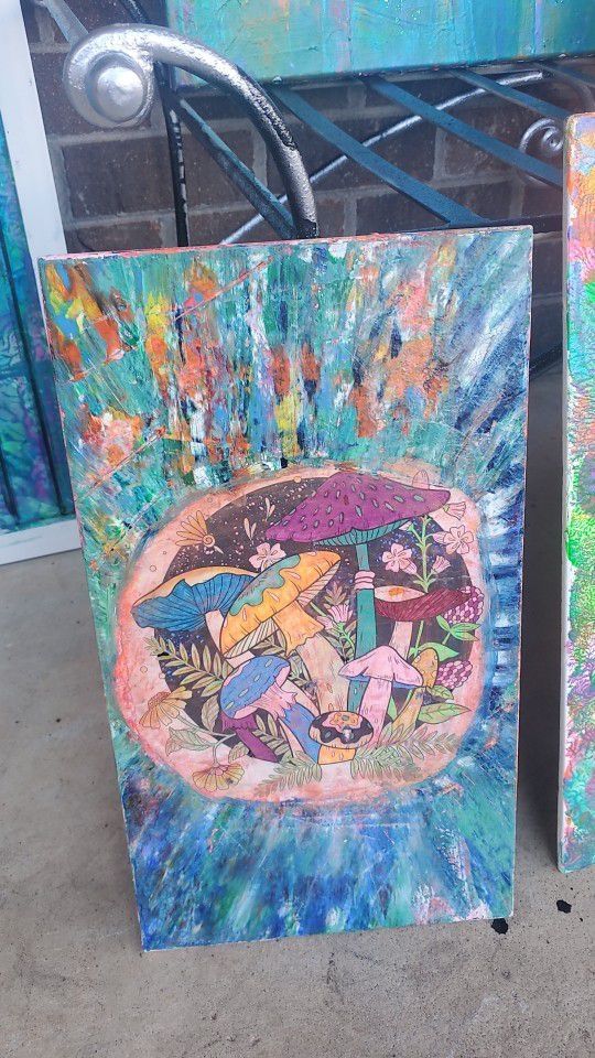 Is a black light/UV reactive mixed media painting I did on a refurbished cabinet door it is 9.5x17 it has a colored/ painted color sheet modge podged to it.