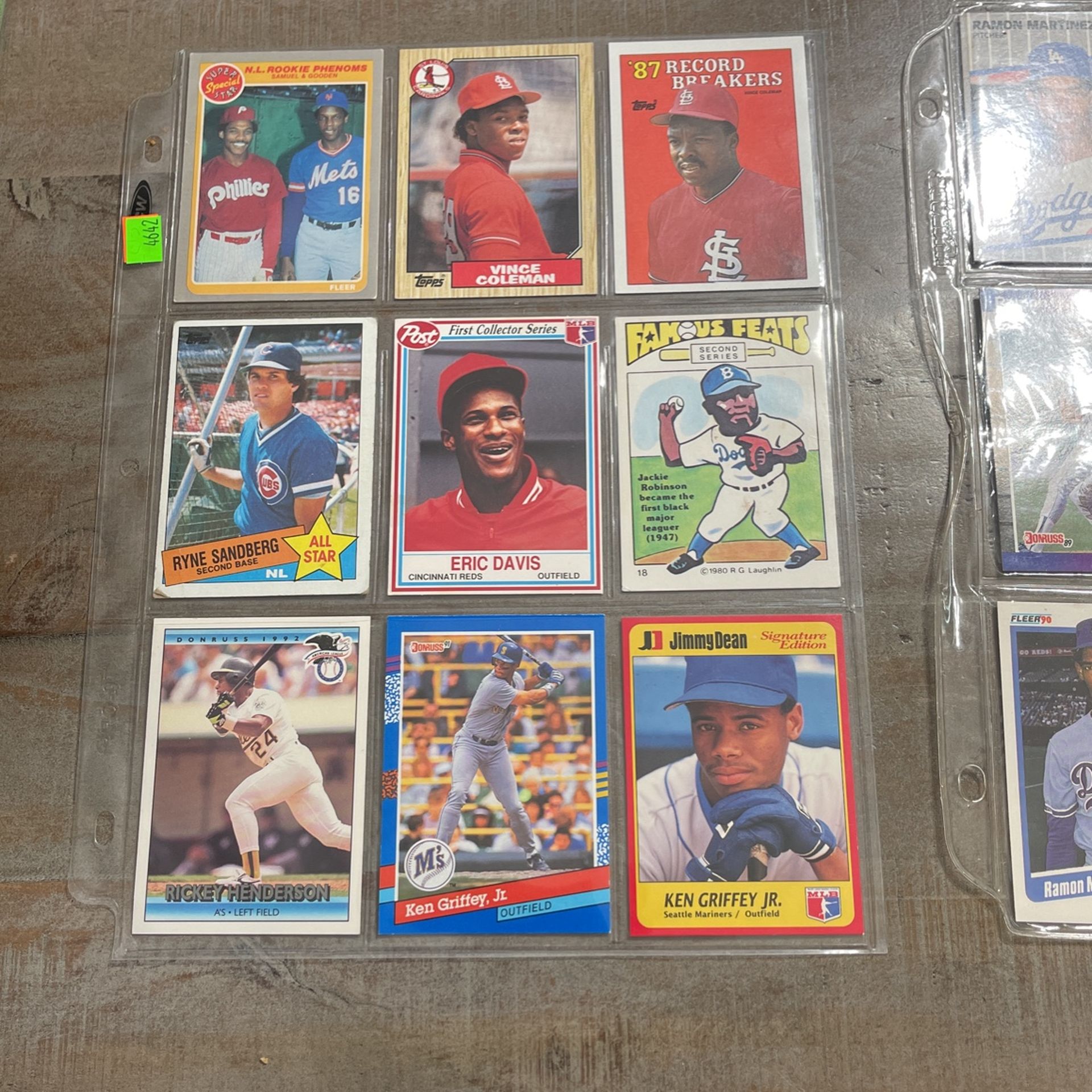 Various cards: Vince Coleman, Ken Griffey Jr, Rickey Henderson, Will Clark, Donruss rated rookies. Over $50 in cards