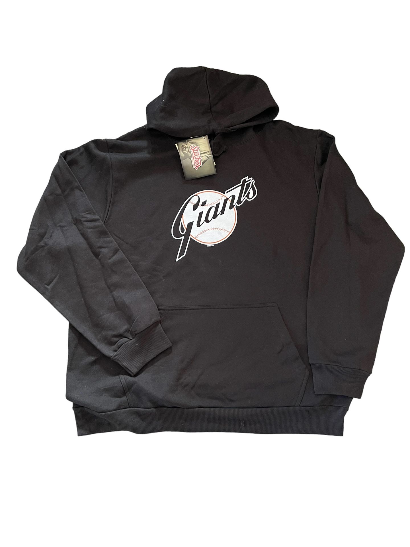Show your support for the San Francisco Giants with this XL hoodie from Stitches. This unisex pullover features a drawstring closure and long sleeves to keep you warm during fall and winter games. The black cotton blend material is machine washable and adorned with a logo accent. Perfect for baseball fans, this hoodie has a solid pattern and graphic print on the front. It also comes with a hood and pockets to keep your head and hands warm. Whether you're going to school or enjoying outdoor activities, this Stitches hoodie is a classic addition to your wardrobe. B6 **feel free to send me an offer