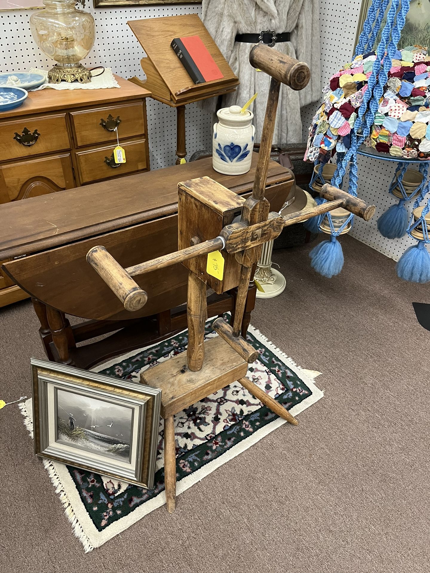 As- Found antique primitive yarn wheel winder. This can be found in booth F16. See photos for location and other info. Measures about: 26” wide and 47” tall