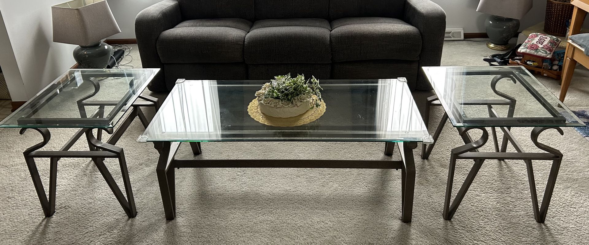 Glass tops on Designer Metal Bases. Coffee Table measures 48x24 inches. End Tables measure 20x24. Very Sturdy. Excellent Condition.