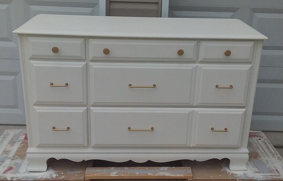 Gorgeous Oak Sumter Dresser with 7 Drawers! The middle & bottom drawers are very deep/long drawers. The dresser is painted in cottage white. The hardware is painted in bright gold. Dims 32-1/4"H x 50"L x 19-1/4"D.