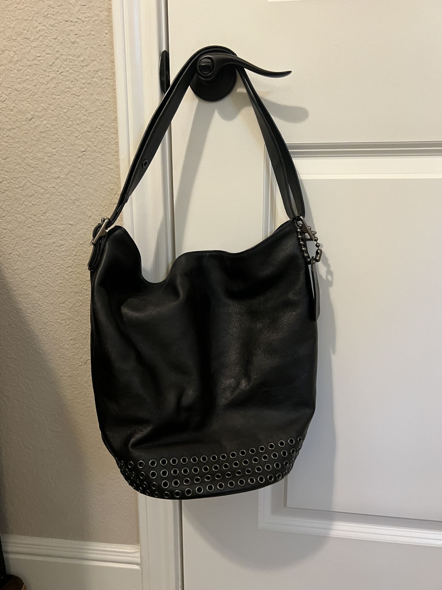 Shoulder strap extendable and can be carried as crossbody if wanted. Color is black.