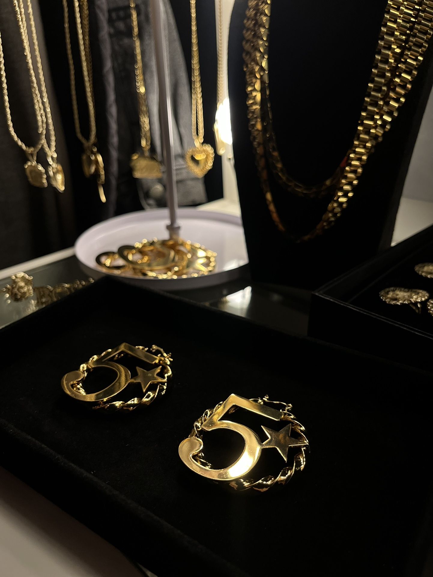 1 pair of Gold 5⭐️ Hoop Earrings 50CM High-quality stainless steel with 10K and 14K gold plating. They’re designed to be durable, stylish, and perfect for everyday wear while keeping that beautiful gold finish. I have other products listed on my page, please feel free to look at my page if you are interested in looking for affordable long lasting gold jewelry ✨🤍