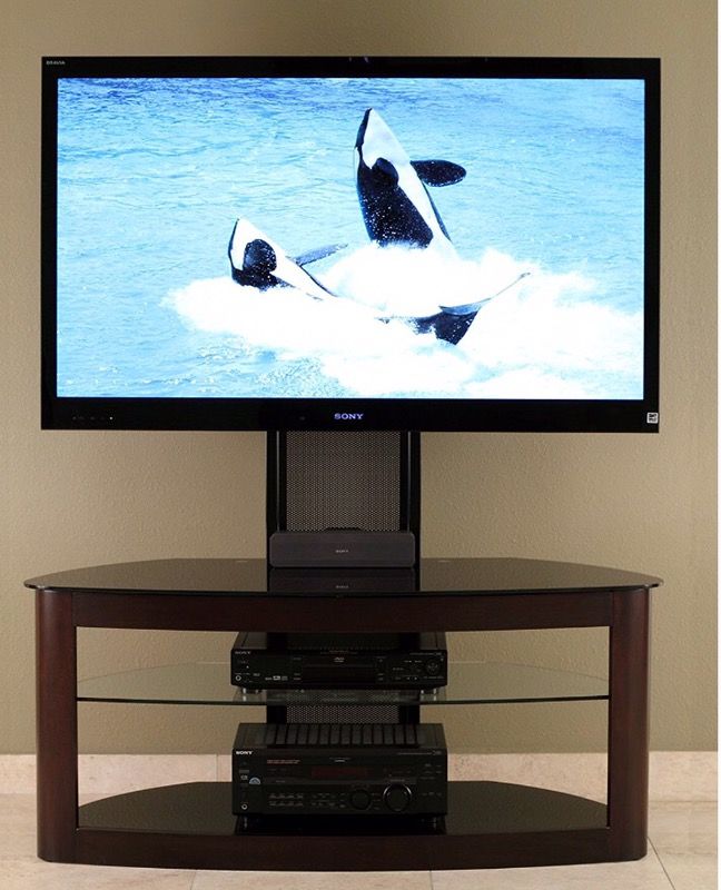 New In Box. TRANSDECO TD600DB TV STAND WITH UNIVERSAL MOUNTING SYSTEM, DARK OAK/BLACK Holds up to 65" or 150 lbs