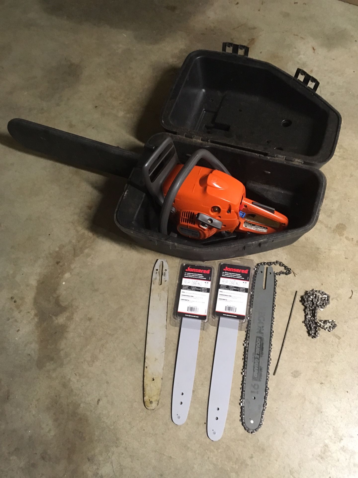 I have Husqvarna chainsaw used few times but I didn’t work few months and now it doesn’t work so good.Start and runs but I think need to clean carburetor. 1.Chainsaw 2.Chain saw case 3. 16” and 14” extra bars =4 pcs. 4. Extra chain 5.chain saw files Everything for $ 130.00 Price is firm!!!