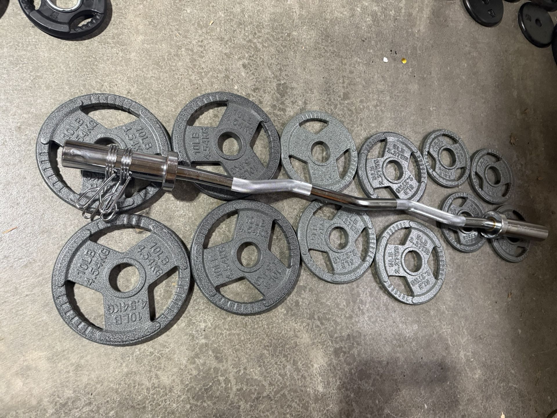 Top quality, perfect condition very heavy bar with clamps. This is the best bar anywhere amazing weights more available. Weight dumbbells