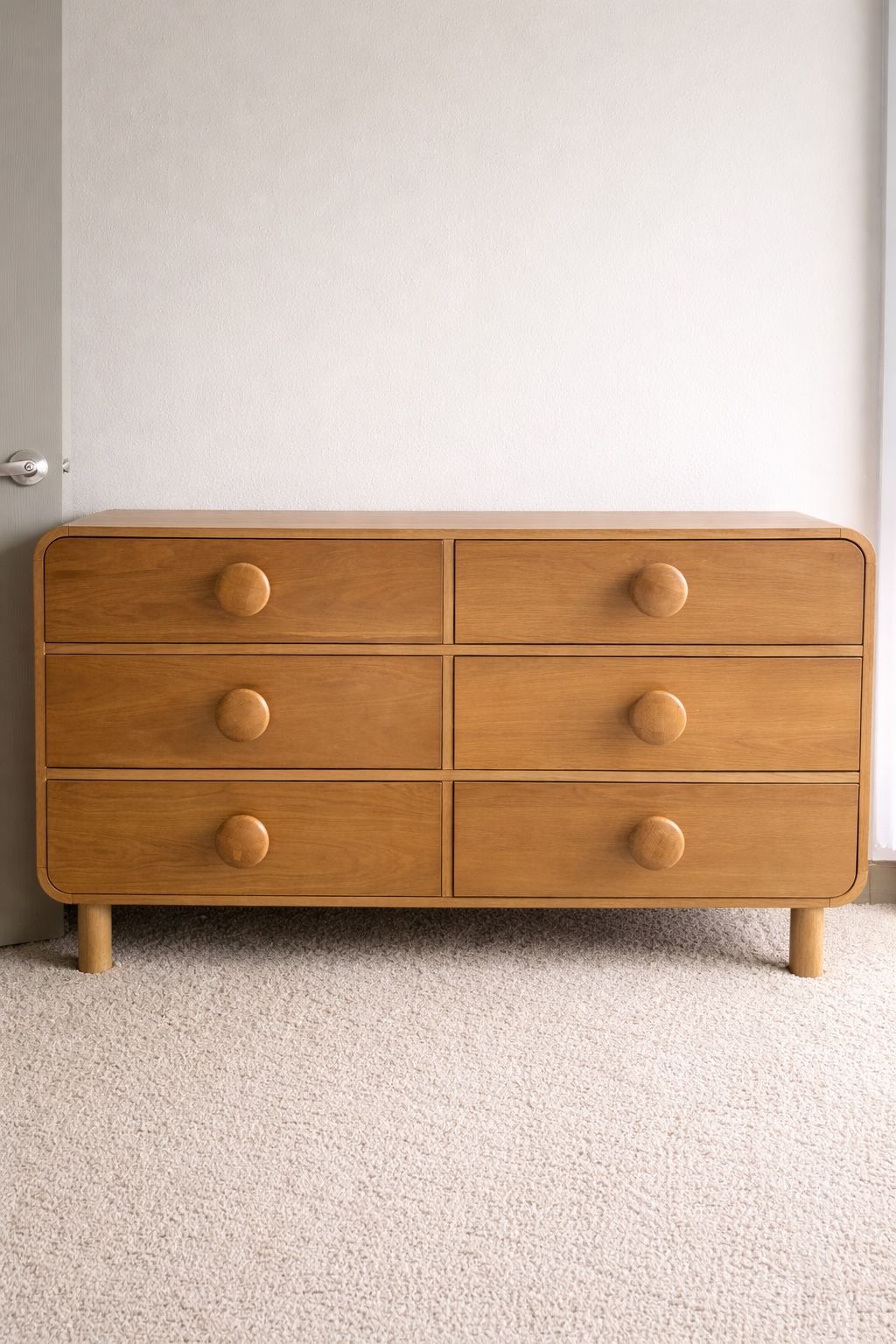This solid wood dresser by Urban Outfitters features a clean, modern design with six spacious drawers and smooth rounded handles. Crafted from natural wood, it offers both durability and timeless style for any bedroom or living space. PICK UP ONLY