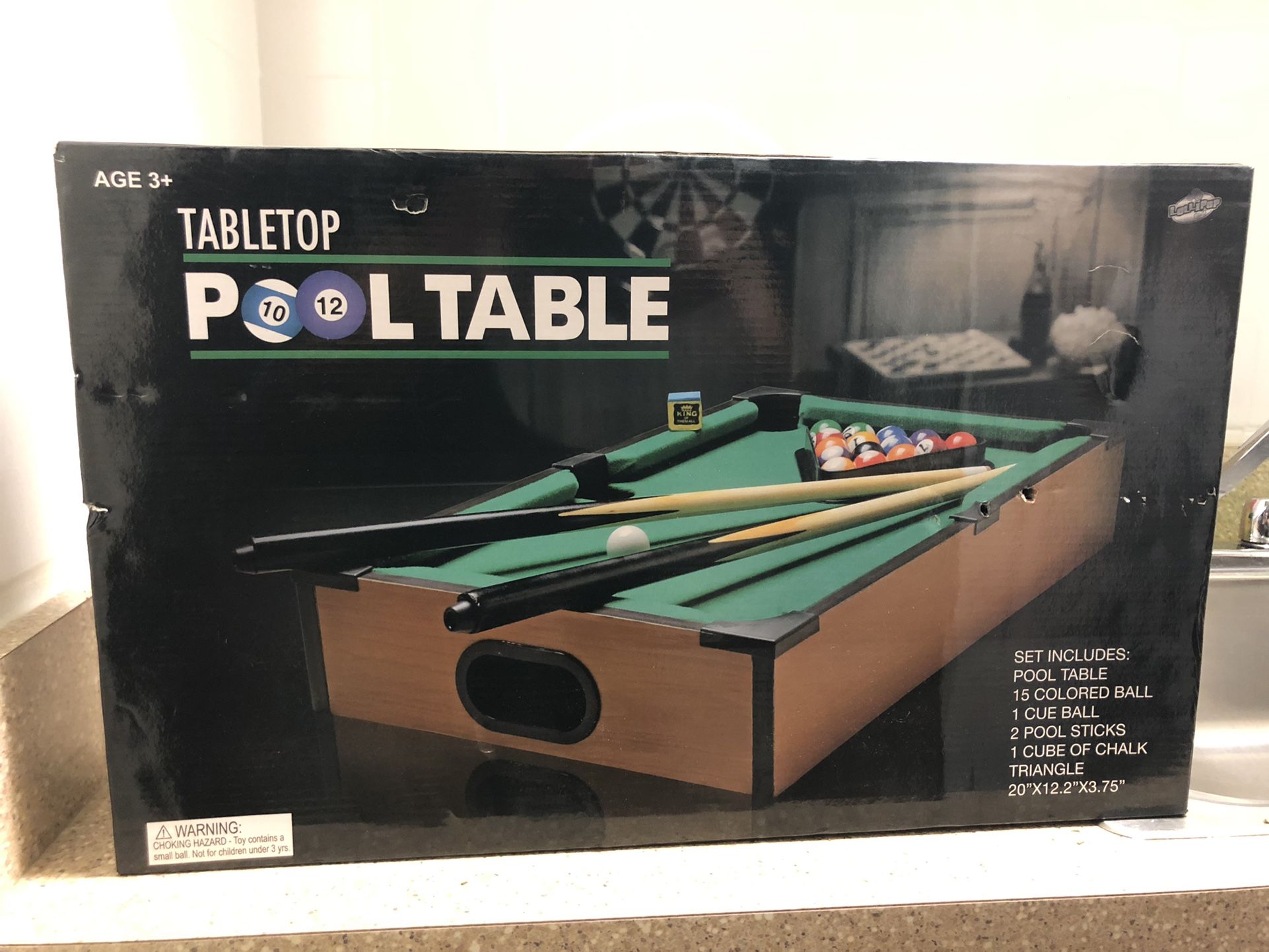 This TableTop Pool Table is brand new and has never been opened. Mint condition. Fun for all ages