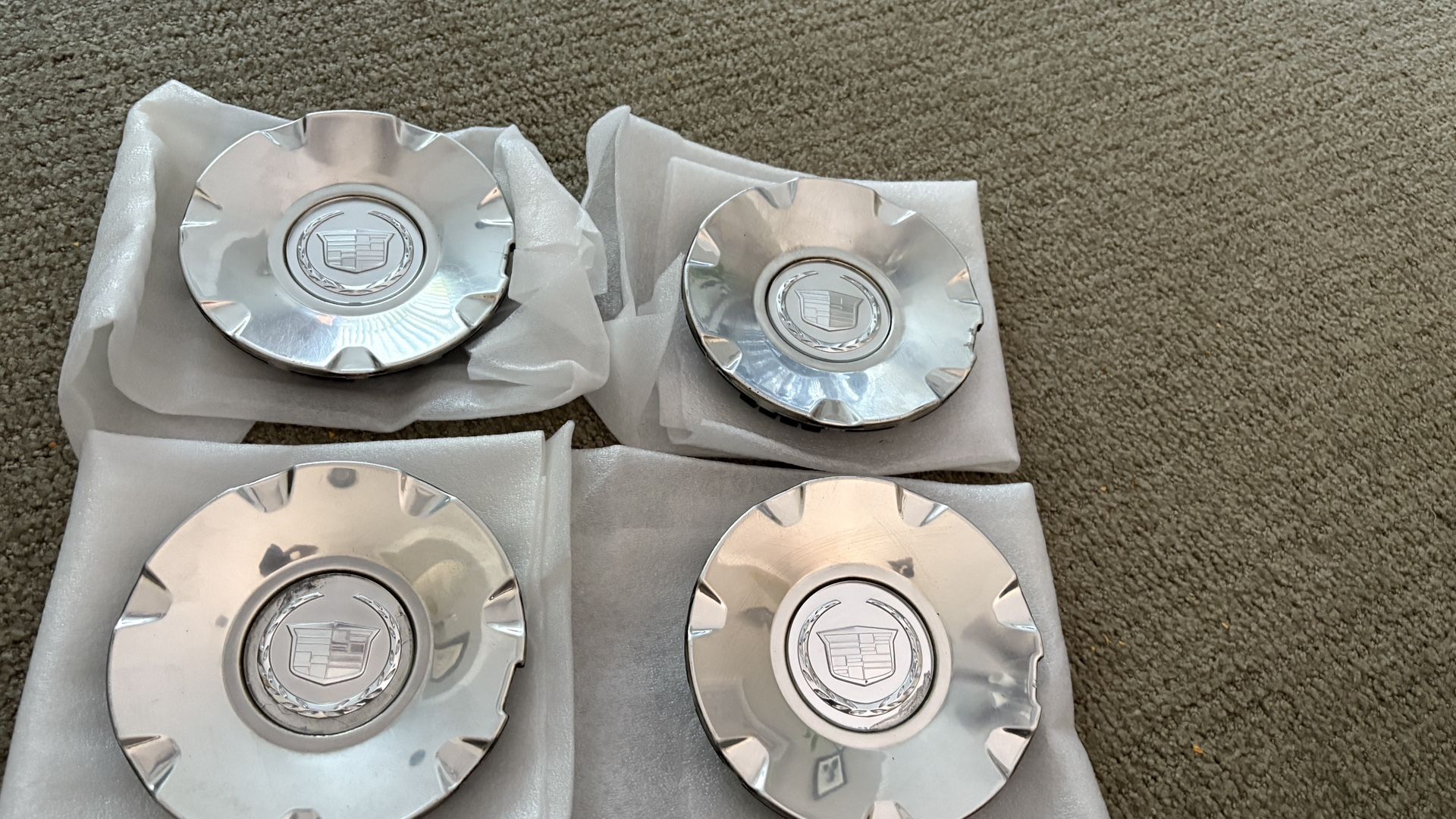 4 Center caps for Cadillac STS wheels. Good condition. No broken tabs. (Wheel shown not included).