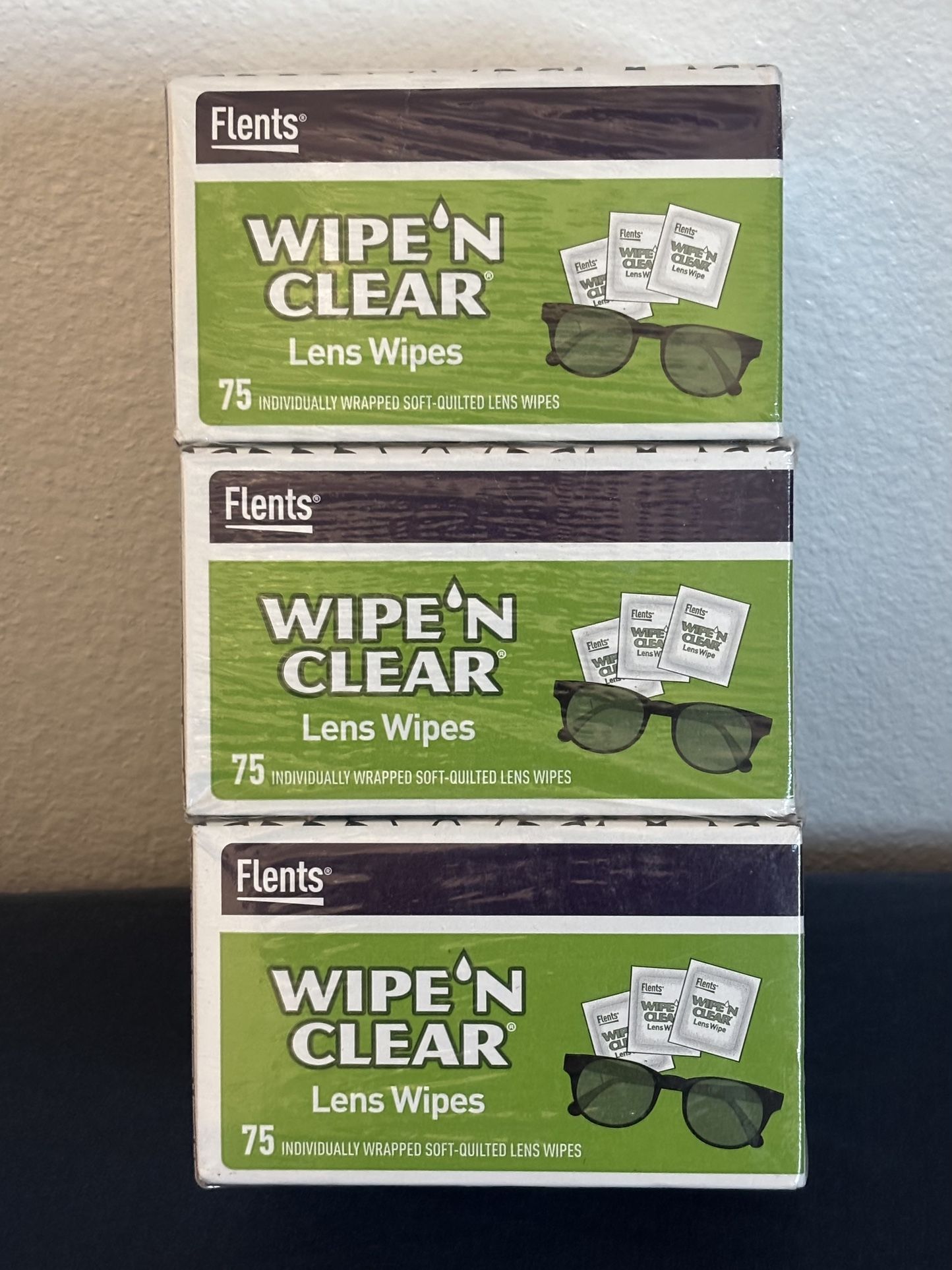 Flents -3Boxes-Wipe N Clear Lens Wipes 75 Individually Wrapped Soft-Quilted Lens Wipes - New This is a 3 pack Boxes of Wipes. The Top one was opened with a few missing just to try them out. Each box has 75 individually wrapped alcohol Lens wipes, softer wipe that is wood pulp based, anti-streak formula for use on eyewear, CD's and DVD's Video Game screens or Laptop. Perfect for clear vision for Sunglasses,safety glasses,goggles ,Prescription lenses .DIY finishing and inspection. Gardening, handling of small components, maintenance, logistics and warehousing. Gym equipment Workouts, Driving, painting homes, living room,bathroom,bedroom,kitchen,interior and exterior Garage work with Using tools and instruments. Perfect for all of your Home, DIY, Commercial, Industrial and Handyman jobs or Projects. Cheaper than Home Depot,Lowe's,Walmart,Best Buy, Target or any Computer,Hardware store and most online tool websites. For use by Business, personal, contractor professionals alike. Thanks for Looking Cash Only Local Pick Up