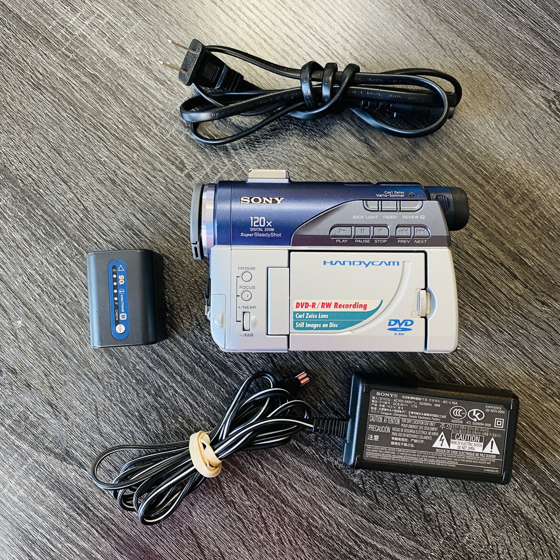 Sony Handycam DVD Camcorder DCR-DVD100 W/ Battery & Charger Tested Works. Plays and records on disc smoothly. With NightShots. Battery is used and may have to be replace. Charger is original and works perfectly. Screen has a patch from long storage, but not noticeable on playback. Check all pictures and feel free to ask questions. Includes only Camera, battery and Charger.