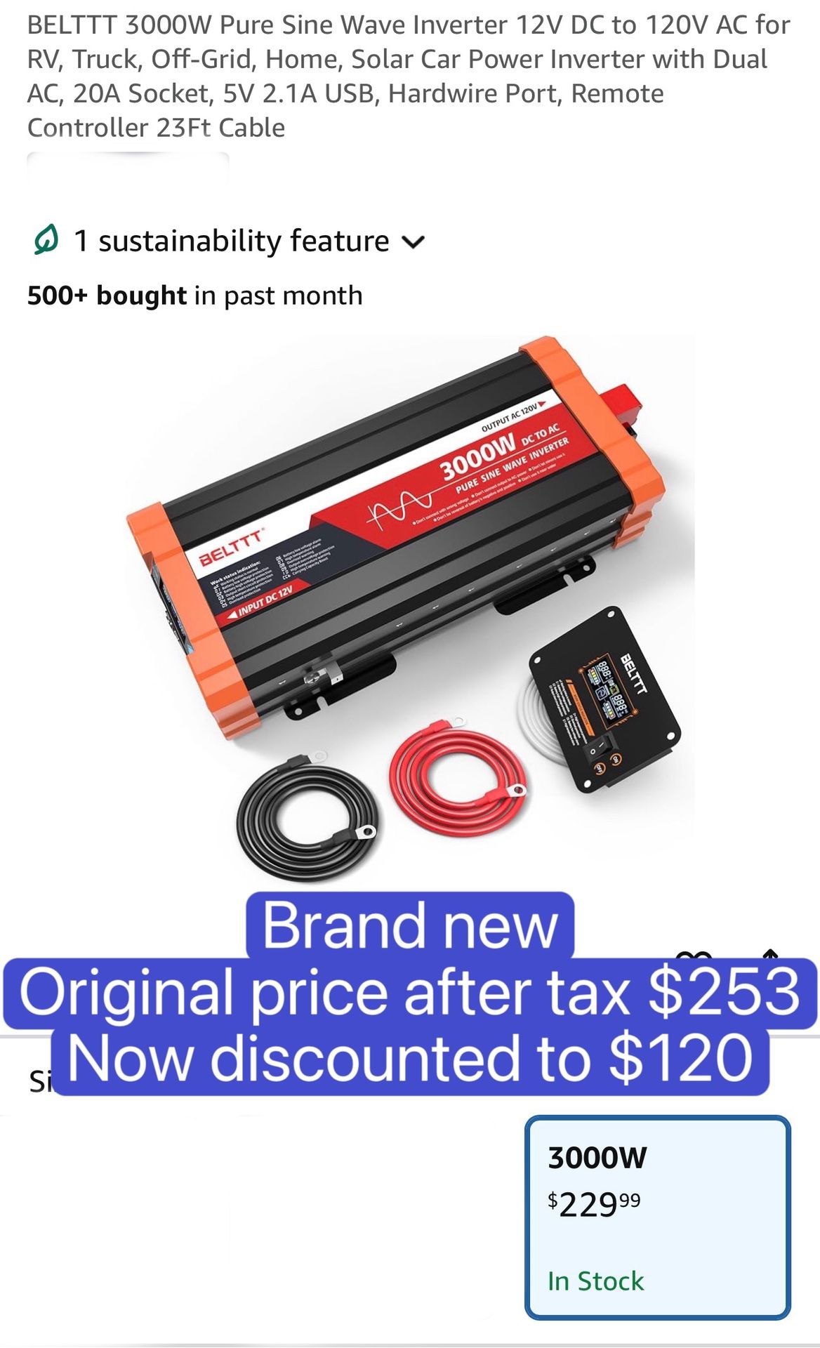 3 in stock 3000W Pure Sine Wave Inverter 12V DC to 120V AC for RV, Truck, Off-Grid, Home, Solar Car Power Inverter with Dual AC, 20A Socket, 5V 2.1A USB, Hardwire Port, Remote Controller 23Ft Cable