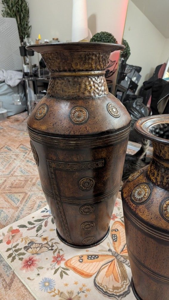 These are high-quality indoor/outdoor decorative vases with a floral relief design and a rich brown finish. Perfect for entryways, living rooms, patios, or staging your home.