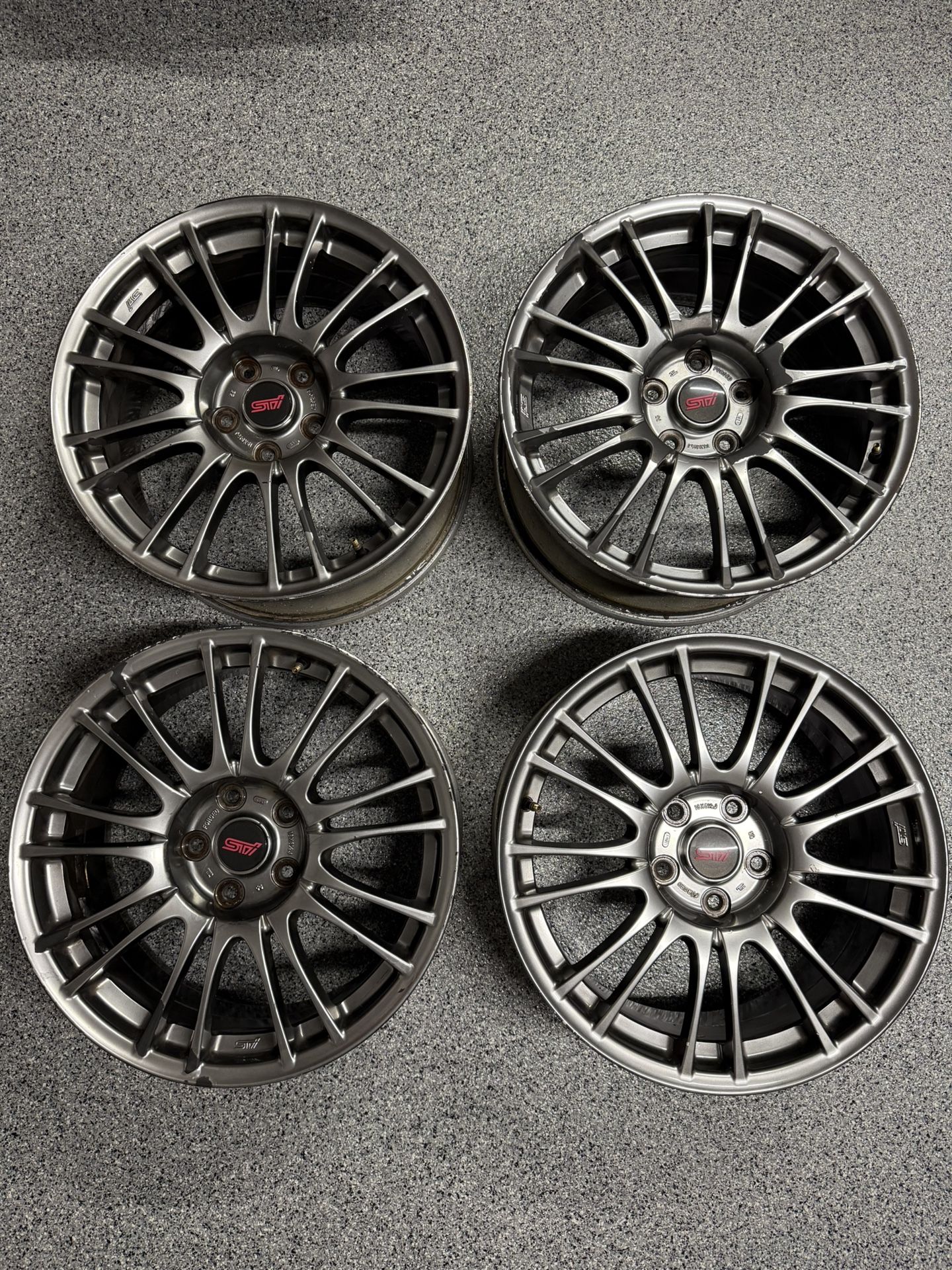 Manufacturer: BBS (for Subaru Tecnica International) • Size used on 2011–2014 STI hatch & sedan: 18 x 8.5J, 5x114.3 bolt pattern • Finish: Dark Gunmetal / Hyper Silver (factory name varies by market) • Type: Forged aluminum • Offset: +55 mm These were the optional forged wheel package on the 2013 WRX STI (and standard on some trims like the Launch Edition). Please feel free to reach out if you have any questions or concerns. These wheels are original and tire mount ready. They have not been repainted or fixed for any reason. Thank you for your time