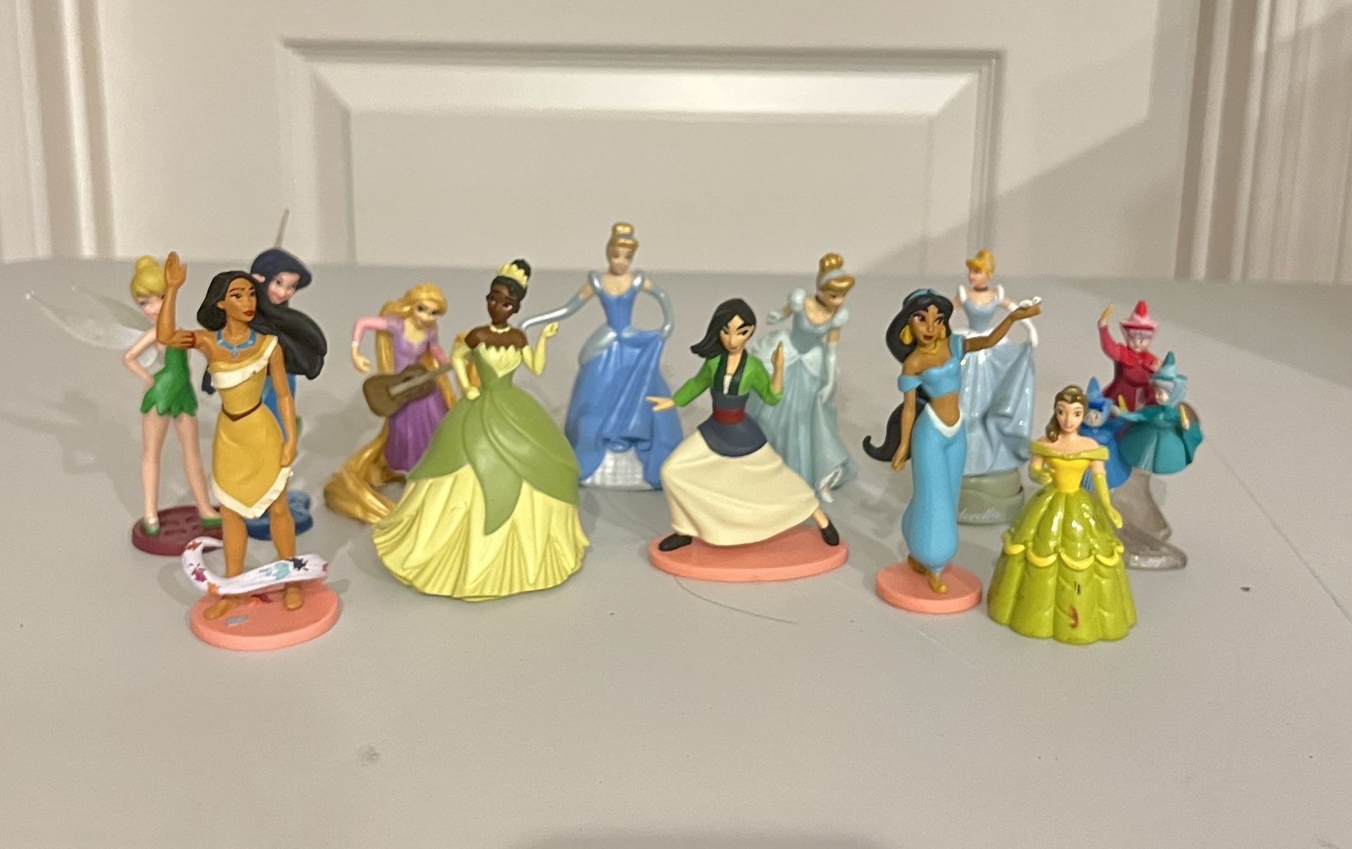 DISNEY PRINCESS 12 Figure Play Set Cinderella Rapunzel Mulan Tiana & VTG Stamp This listing comes with 12 pieces, one of the Cinderella Is a vintage stamp. Ships next business day.