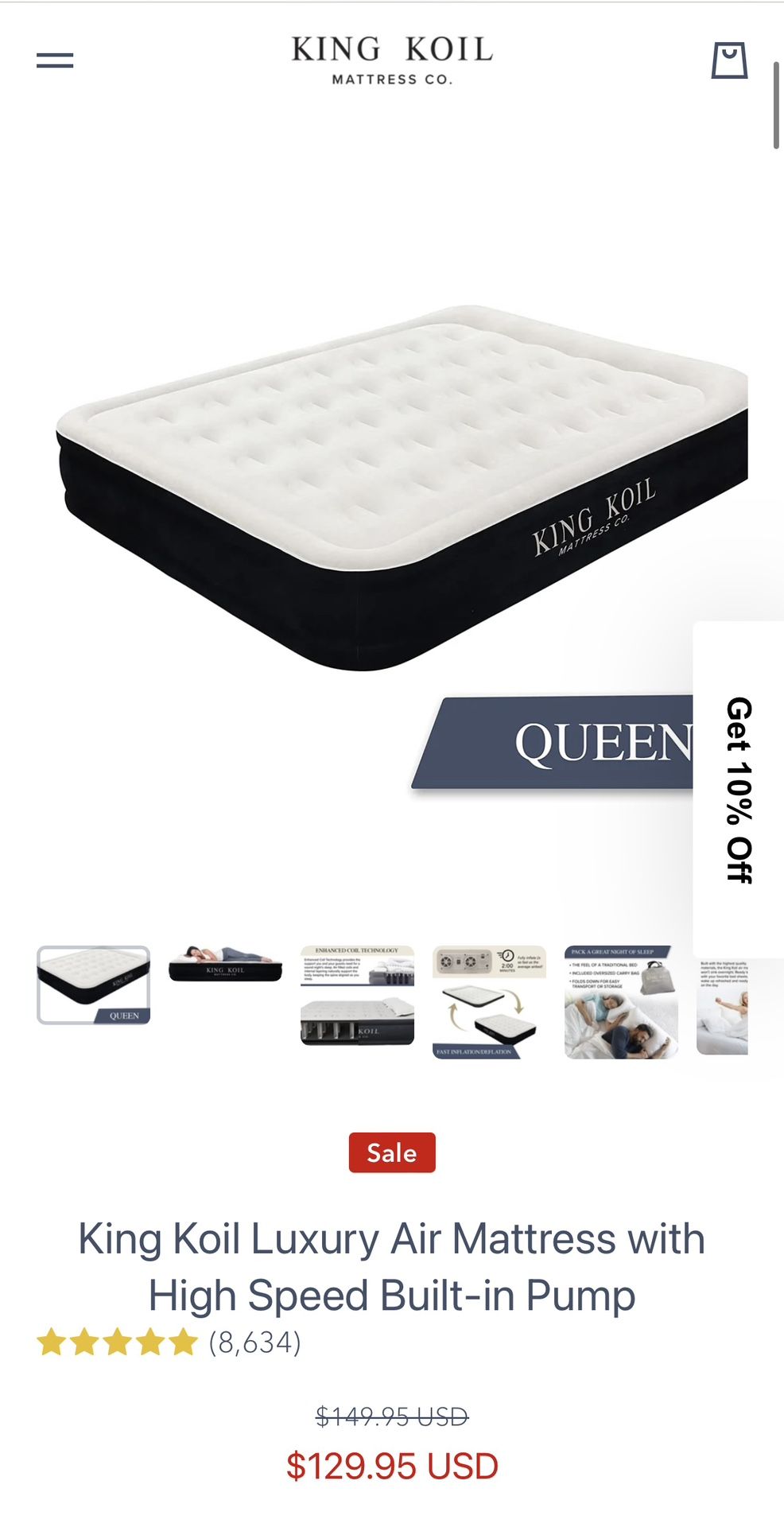 King Koil brand air mattress. It’s 20” high. It’s a queen size. It’s in perfect condition. It comes with a built-in air pump.