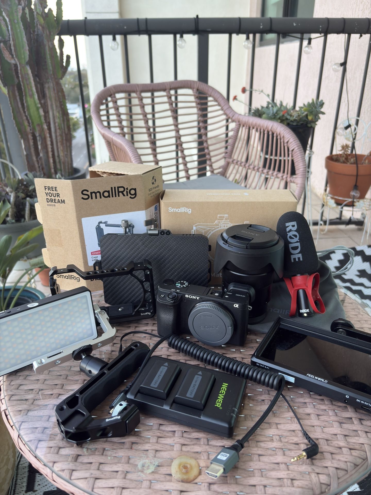 PRICE NEGOTIABLE -small rig cage -light -matte box -lens hood -3 camera batteries and charger(other battery in camera) -small rig top handle -feelworld monitor with battery and charger -rode mic -cables for mic and monitor
