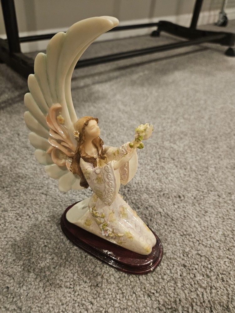 This is a kneeling angel figurine, likely made of resin with a wooden base. Resin with a wooden base. The angel is kneeling and holding a flower. The figurine has carved details on the wings and flowers on her dress. Like new