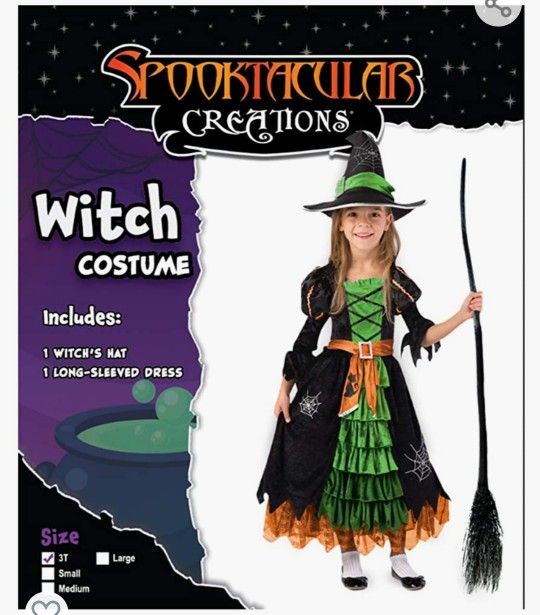 Green Witch Costume includes Witch’s Matching Hat and Full Skirted Dress for Kids. The broom is NOT included. Green Glitter Witch Costume for Girls. Super Durable. Superior Quality. 100% Polyester. Was tried on for a photo Retail $39.99