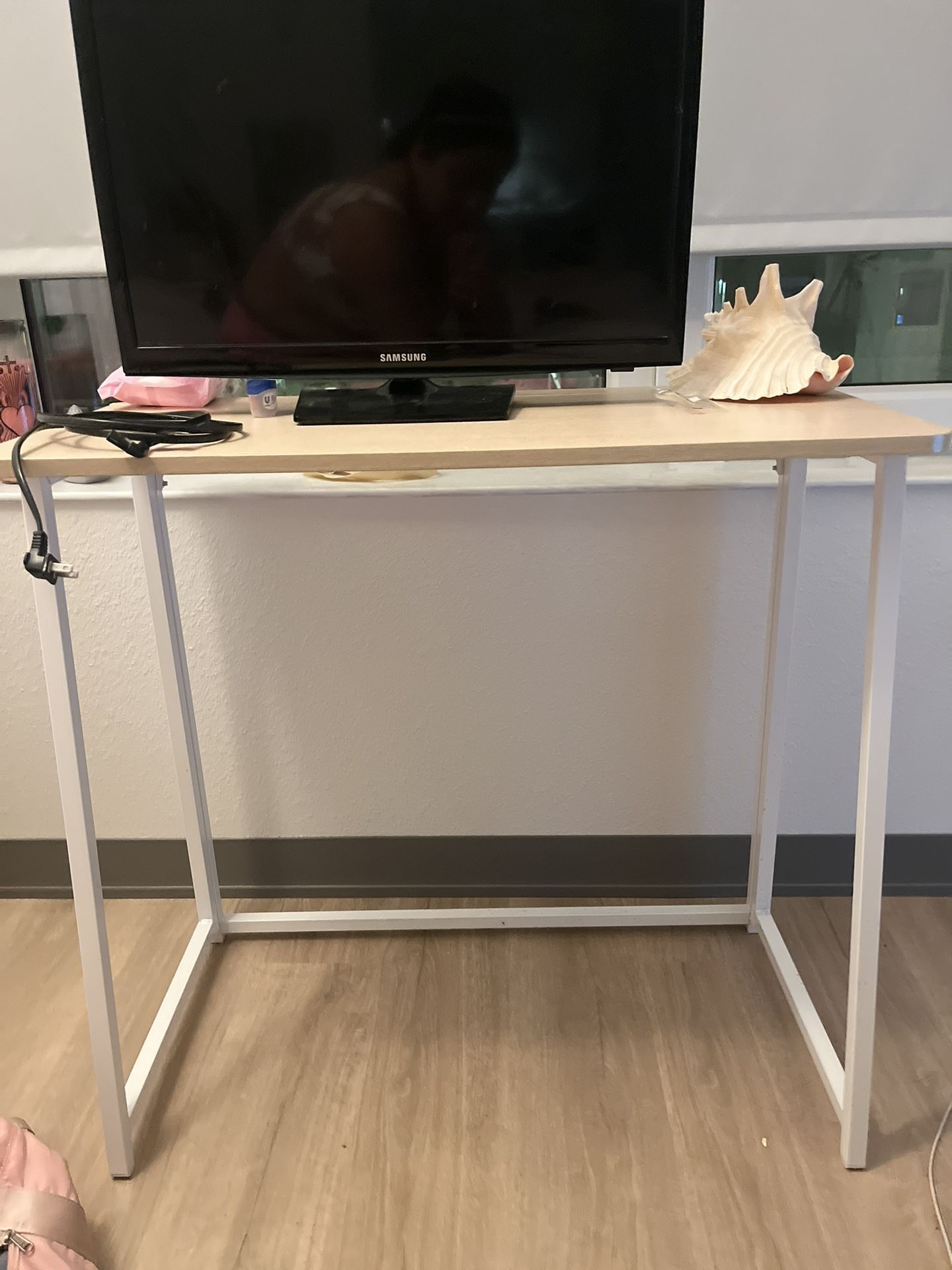 Small beige foldable desk. I had this in my old room before I moved out and it was a good desk. It has a little hanger on the side for headphones. Perfect for small corners