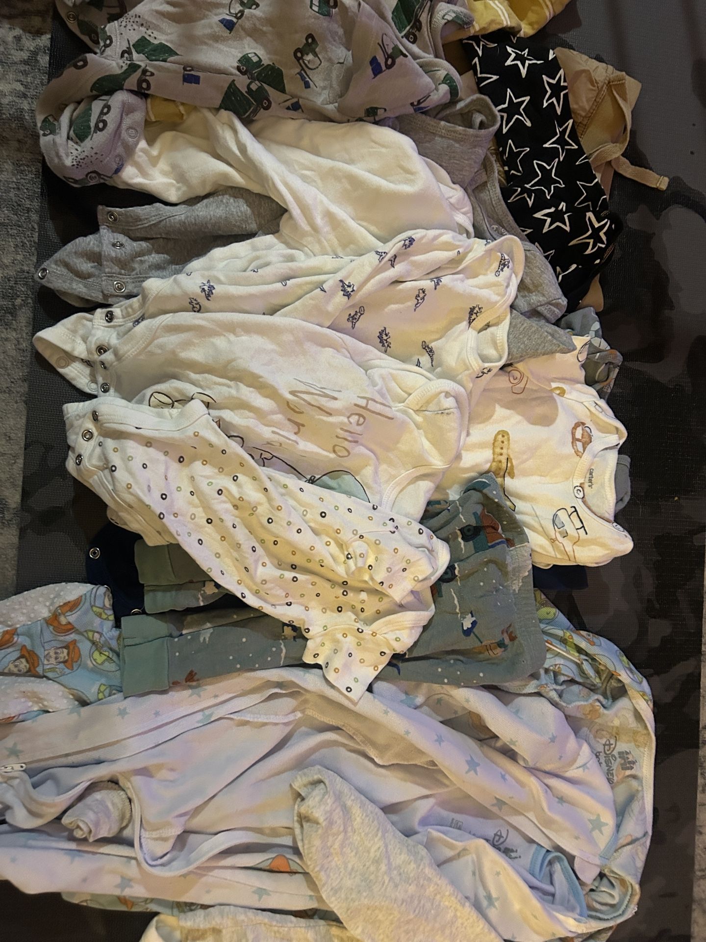 Collection of baby clothes, Carter, cloud island, Disney, old navy. Not all pictured. Sizes ranging from newborn to 18 month. Onesies, pants, pajamas, socks. 30+ items, lightly used. From home that has dogs