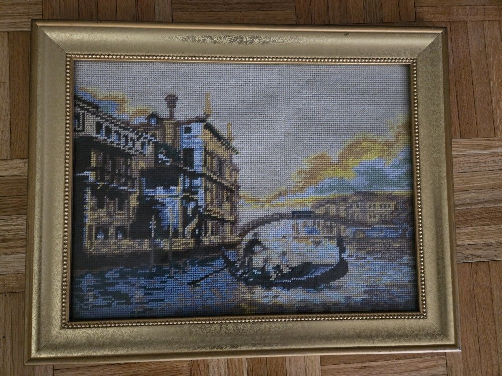 Beautiful, handmade Venice canals Needle Point cross stitch in frame with glass. 19x15 inches. Pickup in West Hollywood