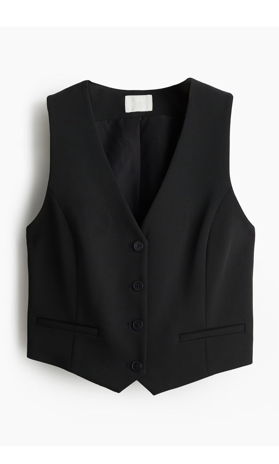 H&M Short, fitted vest in woven fabric. V-neck, buttons at front, and welt front pockets. Princess seams at front for a flattering silhouette. Lined.