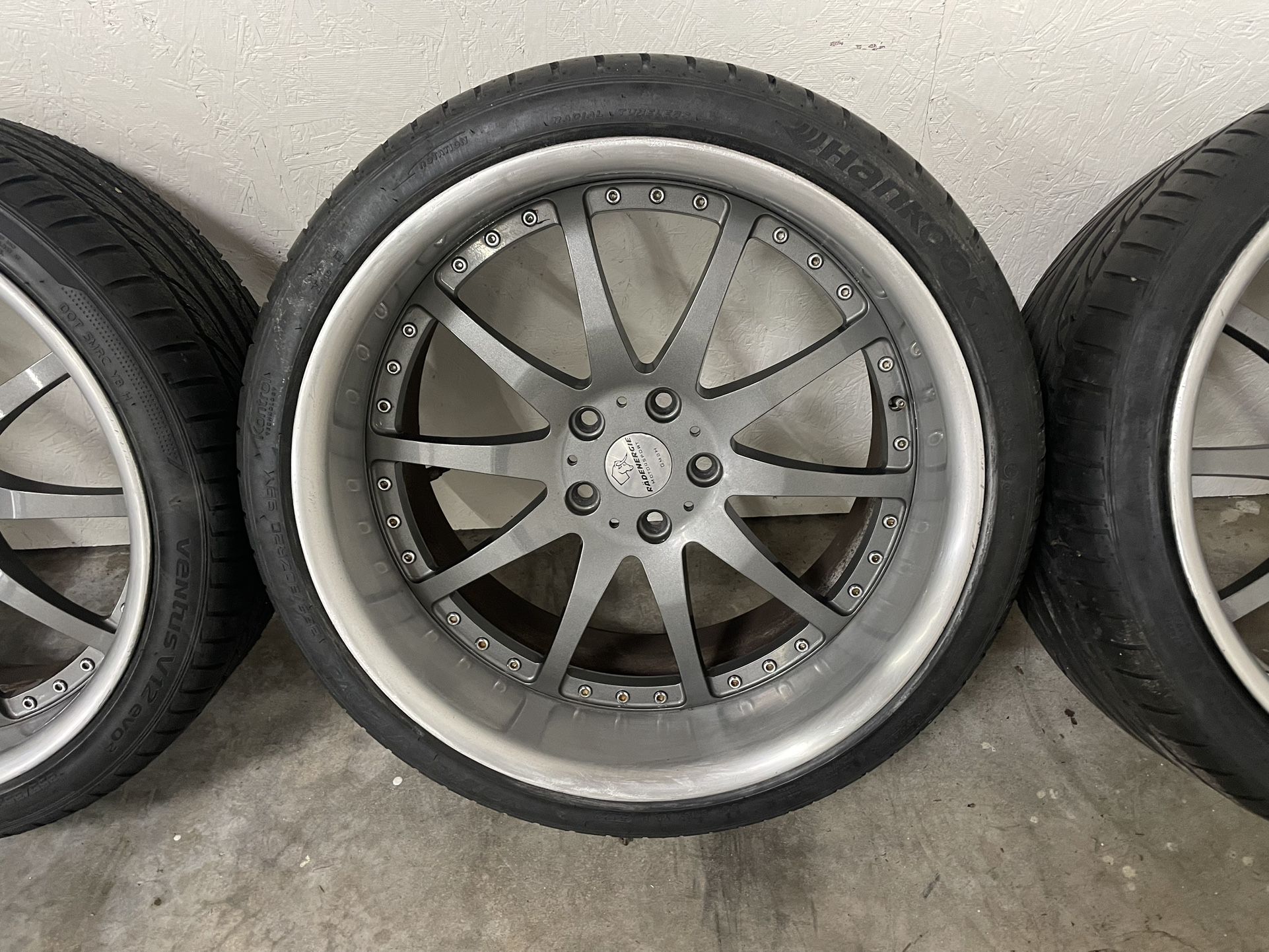 For Sale is a set of Used Radenergie R10 3 Piece Wheels 20x9 ET 19 20x10.5 ET 25 5x120 Bolt Pattern 72.56mm Hub 255/35/20 Fronts 70-75% 285/30/20 Rears 80-85% Dark Gray Face / Polished Lips The Lips Could Use a Polish to Bring it back, No Bends, Cracks or Repairs. Very Good Tread Remaining Hankook Ventus Evo2 on all 4 Wheels TPMS Mounted but for BMW 5 Series Asking $2300 obo Cash/Zelle. No Trades