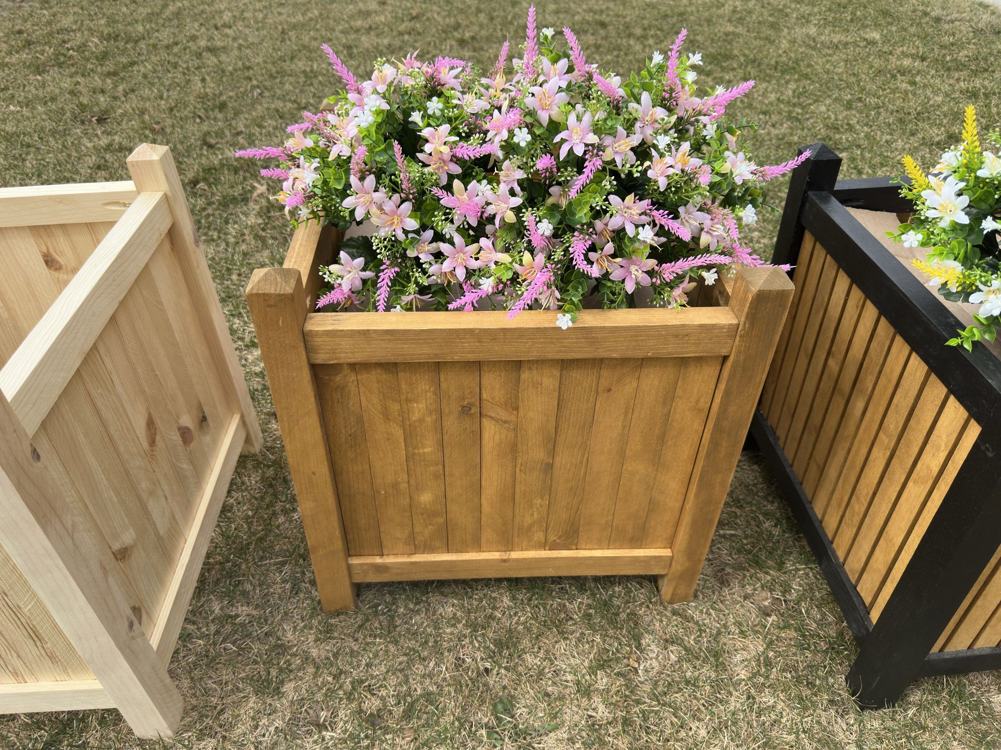 Beautiful handmade wood planter boxes. Plain wood, painted or stained. You can choose color. If we don’t have it, we can make it!! Fill with dirt and plant or use to hide a plant container/bucket. Prices start at $40
