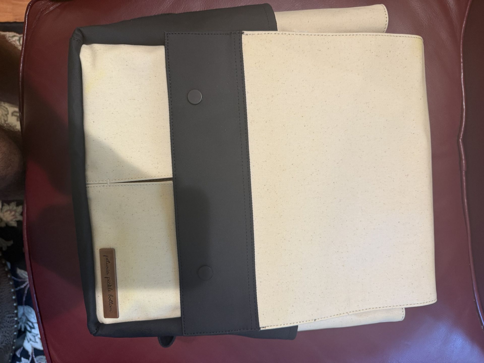 Elevate your everyday style with this modern roll-top backpack by Petunia Pickle Bottom. Designed with both fashion and functionality in mind, this backpack features a sleek two-tone color palette—classic black paired with a soft, natural beige. Whether you're a parent on the go, a student, or a commuter, this bag offers both versatility and refined style. The roll-top closure with magnetic snaps provides adjustable storage space, while padded, adjustable straps ensure all-day comfort. Accented with copper-tone hardware and thoughtfully placed exterior pockets, it's perfect for organizing daily essentials with ease. Features: Brand: Petunia Pickle Bottom Roll-top design with magnetic snap closure Durable two-tone canvas and synthetic material Adjustable black woven straps for comfort Copper-tone metal hardware accents Easy-access front pockets Top handle for grab-and-go convenience Spacious interior, ideal for everyday carry or light travel Perfect as a diaper bag, daypack, or casual backpack This backpack blends everyday practicality with elevated design—ideal for modern parents or anyone who appreciates stylish, smart storage.