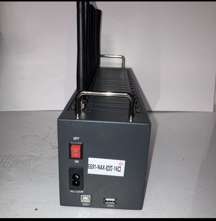 16-Port 4G LTE Cat-1 Modem Pool / SIM Bank This unit features 16 independent 4G LTE Cat-1 modems, each with its own antenna, ideal for SMS, OTP verification, voice, and IoT applications. Uses Quectel EG91 series modules (4G — not obsolete 2G). 🔹 Features • 16 × 4G LTE Cat-1 modem channels • Quectel EG91-NAX modules • SMS send/receive, voice, and data capable • USB connectivity to PC/server • AC powered (power cable included) • Individual external antennas (16 total) 🔹 Condition • Powers on • Physically clean • Removed from working environment • Sold as shown (see photos) 🔹 Notes • NOT 2G (2G is shut down in the U.S.) • SIM cards and software are not included • Buyer responsible for carrier compatibility and setup 🔹 Included • Modem pool unit • 16 antennas • Power cable