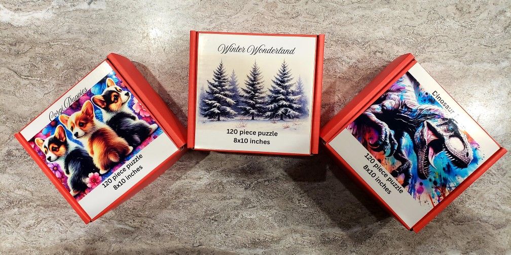 These are custom made jigsaw puzzles. They are 8x10 and 120 pieces. Perfect for small spaces. Kids or adults can enjoy them. Put them together and frame them or take them apart for another day. I also make custom photo puzzles from your own photo. These are $10 each.