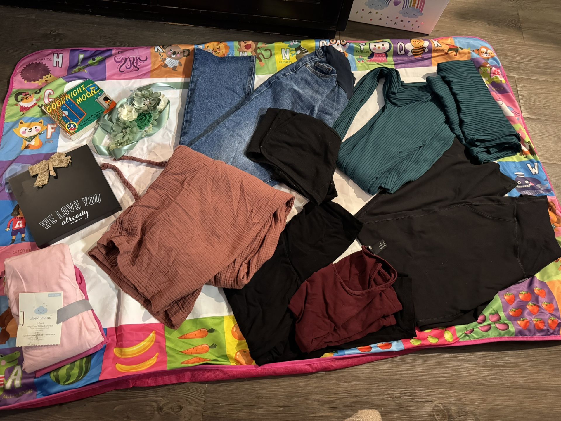Bag of different bottles - $10 Green dress & jacket - $10 Floral Headband - $8 Orange overalls - $10 Pants - $5 each Shorts - $3 Shirt - $3 NEW Crib sheets - $10 We love you baby sign - $5 Baby mat - free