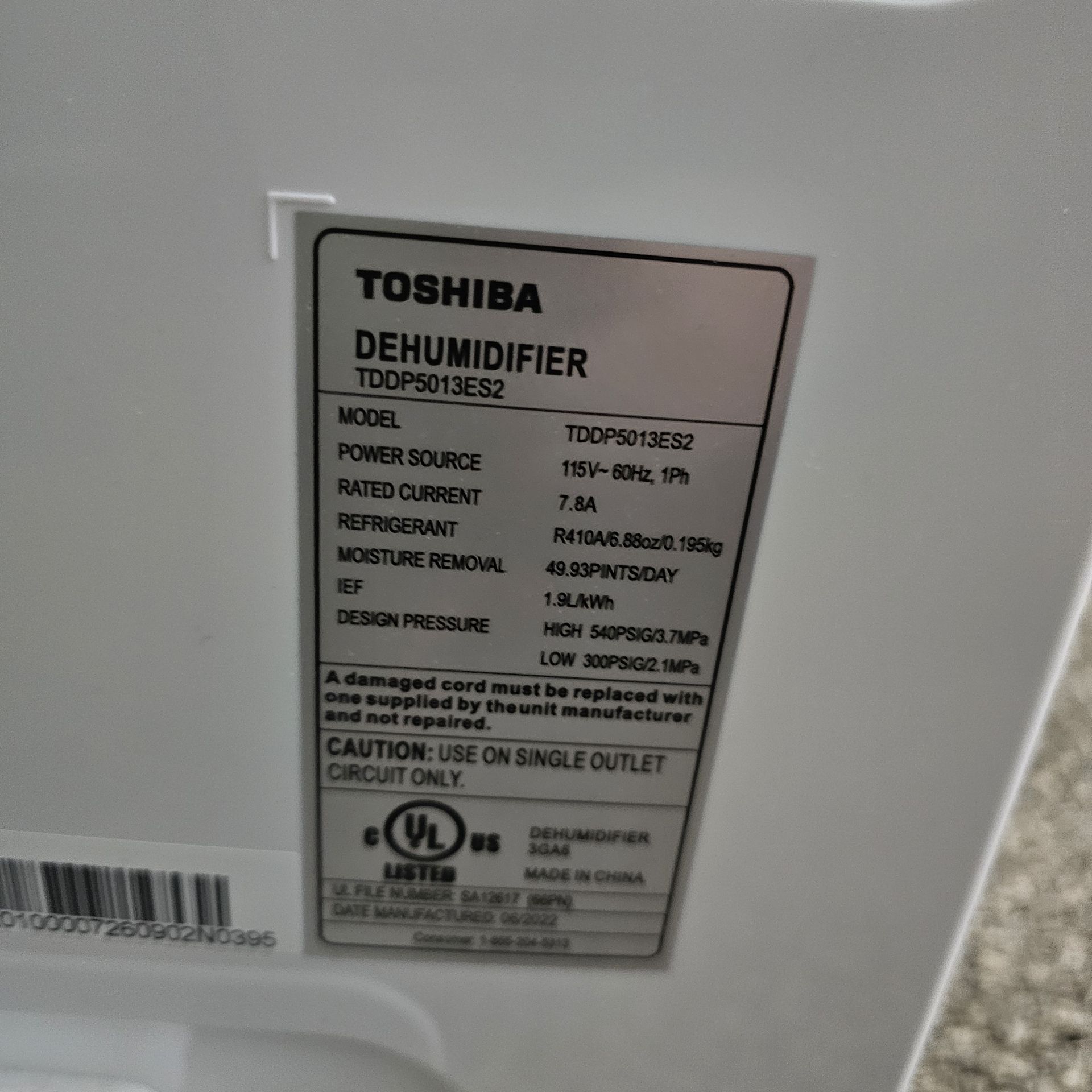 Toshiba Dehumidifier 50 pint - 4500sq. Ft