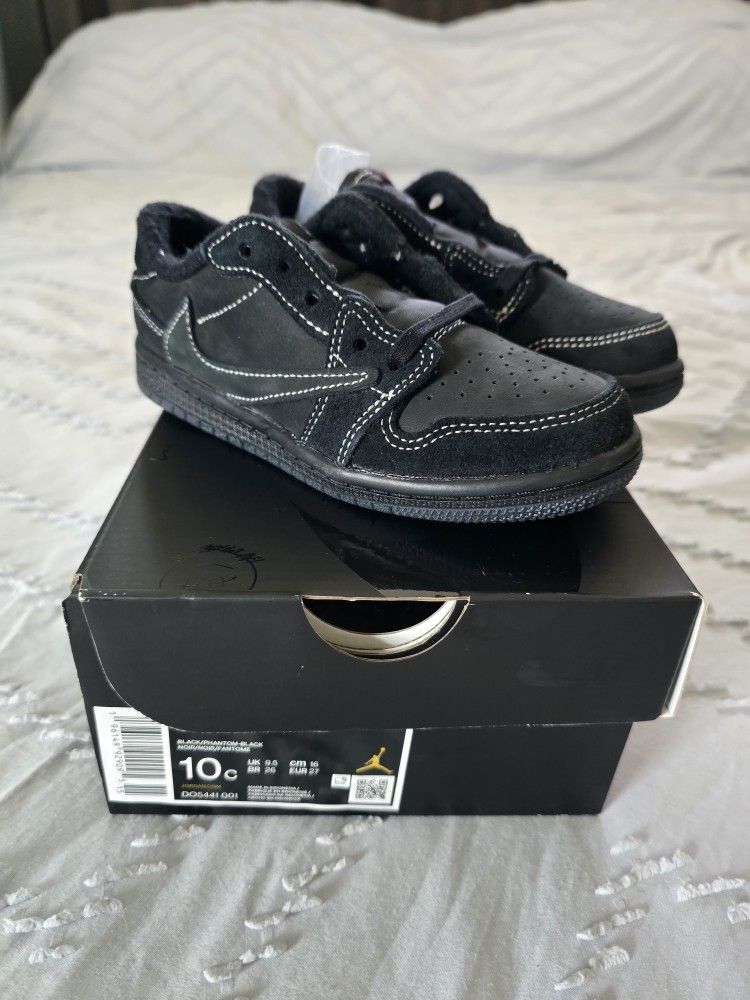 The Jordan 1 Low Travis Scott Phantom Sneakers in Size 10C are a stylish and popular choice for casual occasions. These sneakers feature a lace-up closure, low-top silhouette, and a solid black color with the signature Air Jordan design. The rubber outsole provides comfort and support, making them ideal for basketball or other athletic activities. With a retro theme and standard shoe width, these sneakers are a must-have for any sneaker enthusiast looking to add a touch of style to their footwear collection.
