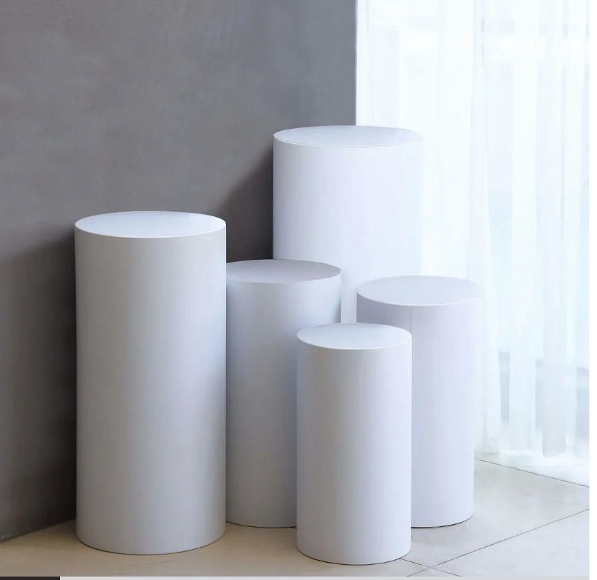 Set of 5 White Metal Cylinder Pillar Prop Stands For Wedding Aisle, Round Plinth Pedestal Display
