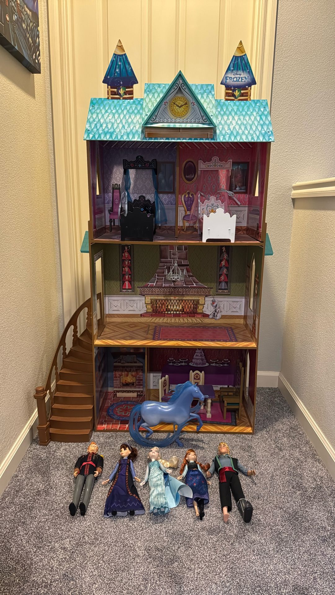 Disney frozen three story castle with staircase. This wooden place that comes with an Elsa bed and an Anna bed as well as the dining room and chairs. I’ve included five Barbie dolls characters from the movie frozen as well as the water horse. Gently used.
