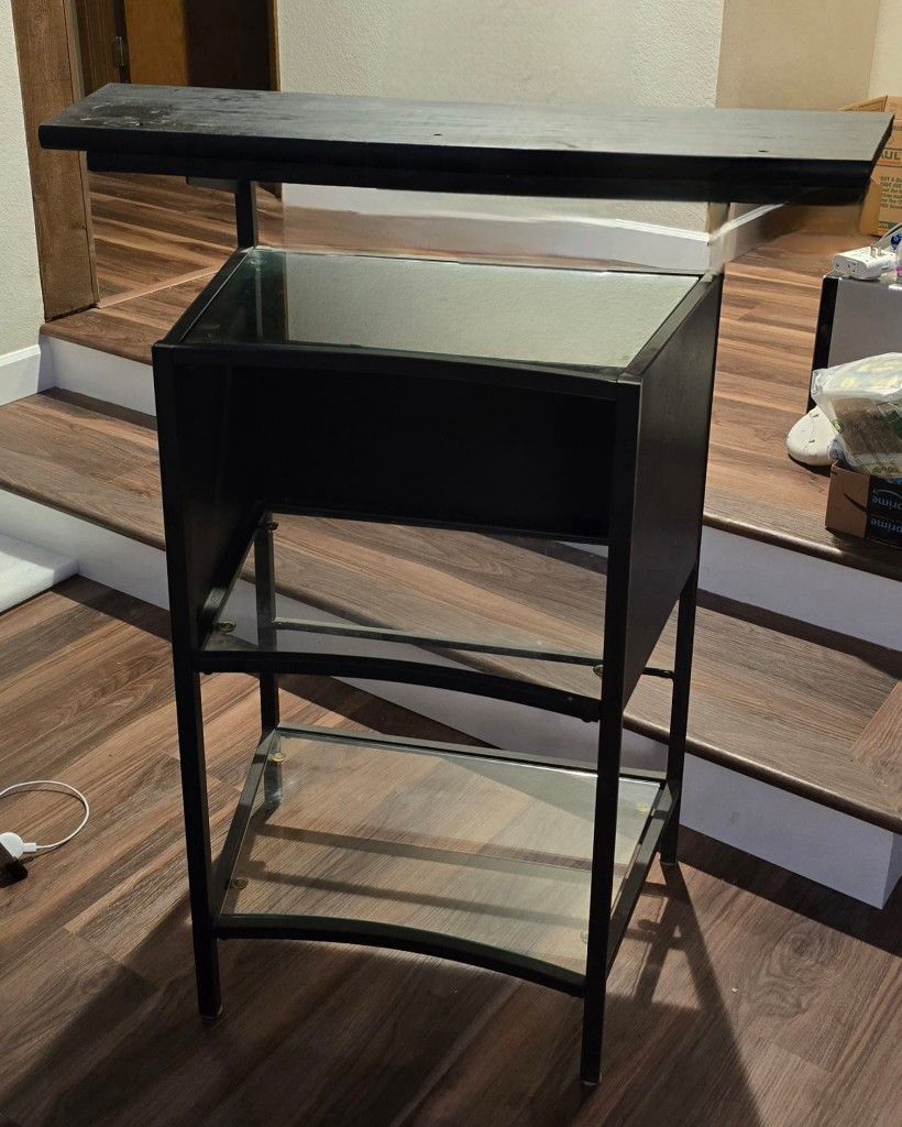 Free TV/Stereo Stand with three glass shelves and on narrow wood shelf. 41.5" tall X 38" wide (top wood shelf, other 3 lower shelves 24" wide) X 17" deep (back to front).